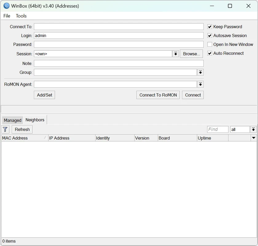 Les administrateurs peuvent se connecter à distance ou en local via des connexions sécurisées ou non. La possibilité de mémoriser plusieurs sessions permet aux utilisateurs d'accéder à plusieurs routeurs. Cet outil léger fonctionne de manière fluide, même sur des appareils peu performants. Bien qu'il ne propose pas de tutoriels intégrés ni d'assistance technique, vous trouverez de l'aide sur YouTube , le wiki MikroTik et les forums.